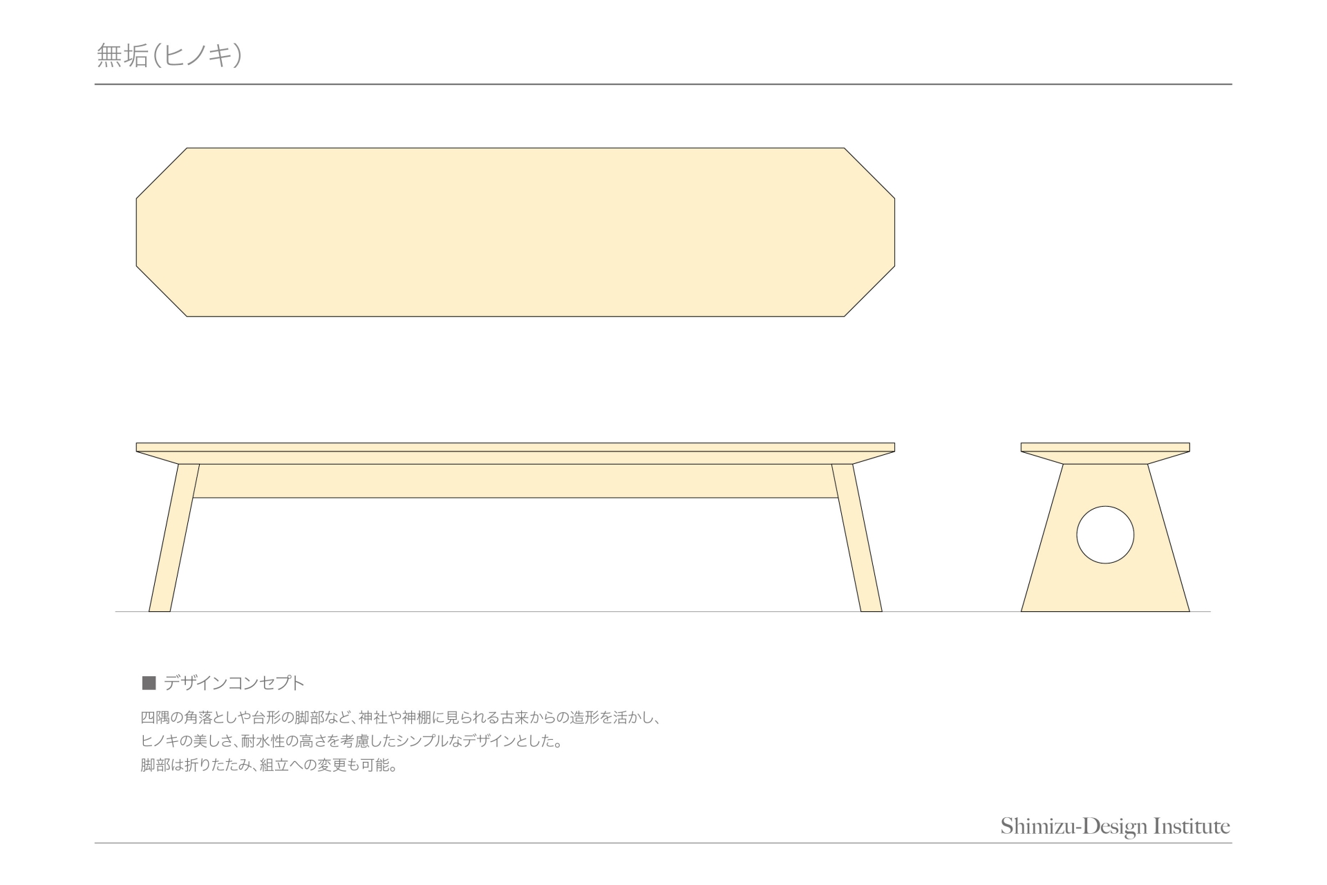 ひのきは、神社仏閣にも広く使われており、天皇陛下がお越しになられることから、正月の鏡餅を載せる三方のような形にしてみました。J-Panelは、パネル表面の表情を活かして面のように使い、座面と脚が折り紙のように内側に向かってスラントしているスタイルが特徴です。