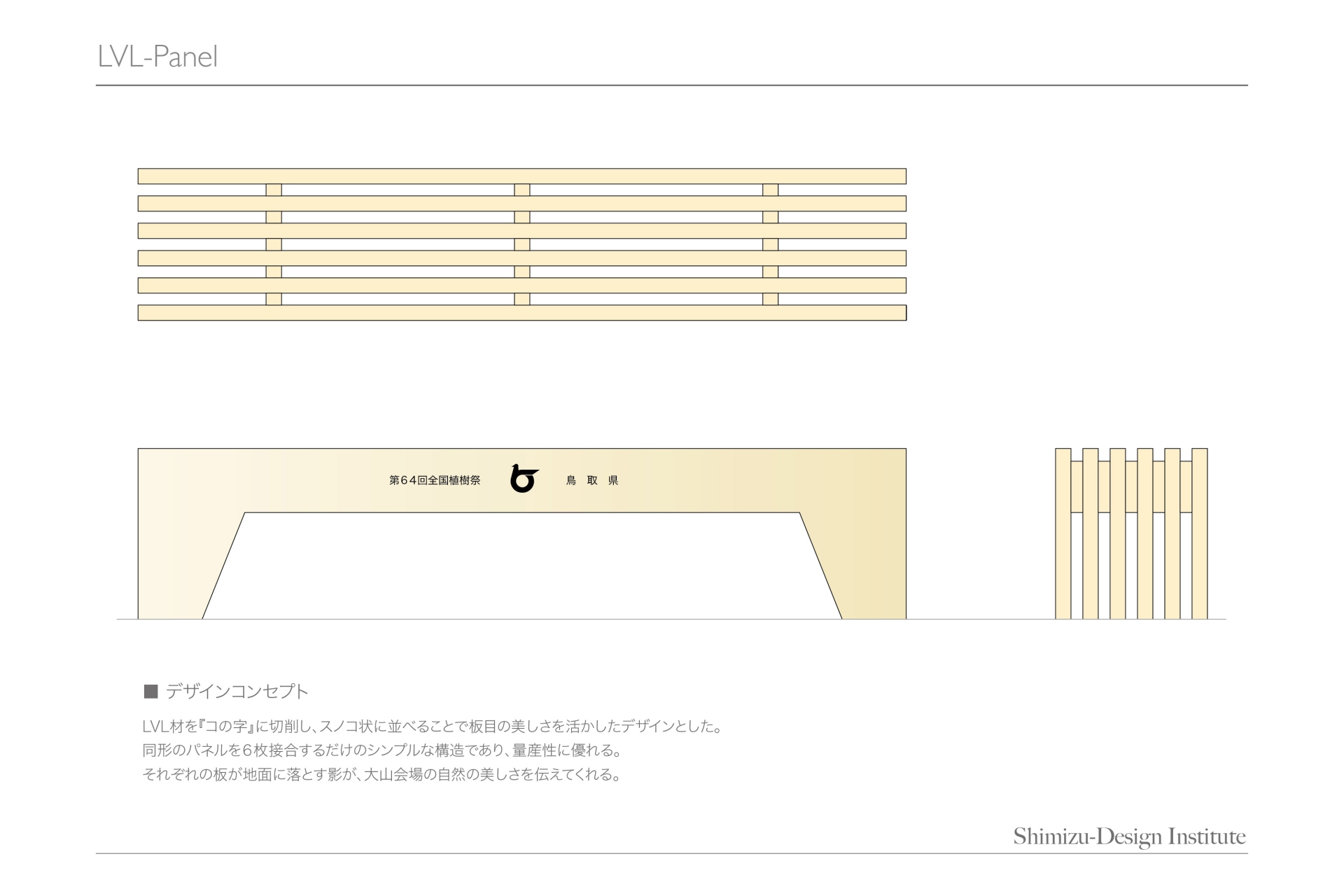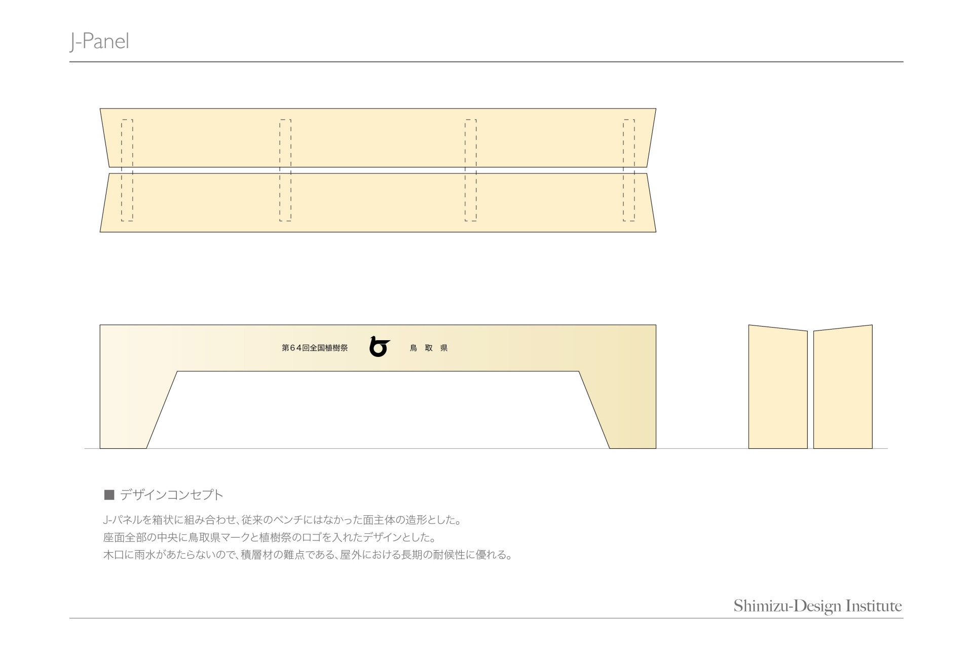 平成25年に開催された「第64回全国植樹祭とっとり2013」のメイン会場に設置する木製ベンチの製造業者を決めるためのデザインコンペが開かれ、県内の家具屋さんからの依頼でデザインしました。