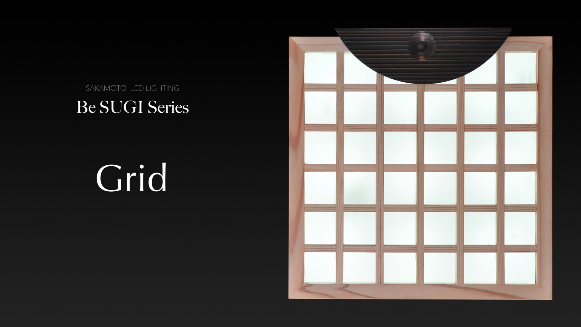 グリッド状に配した杉の桟の裏側(本体側)に、専用に開発した9mm幅のLDE基板から本体内部に向けて発光させ、その光を金属並みの反射率を誇るプラスチックシートで前方に反射させるという手の込んだ設計をしています。