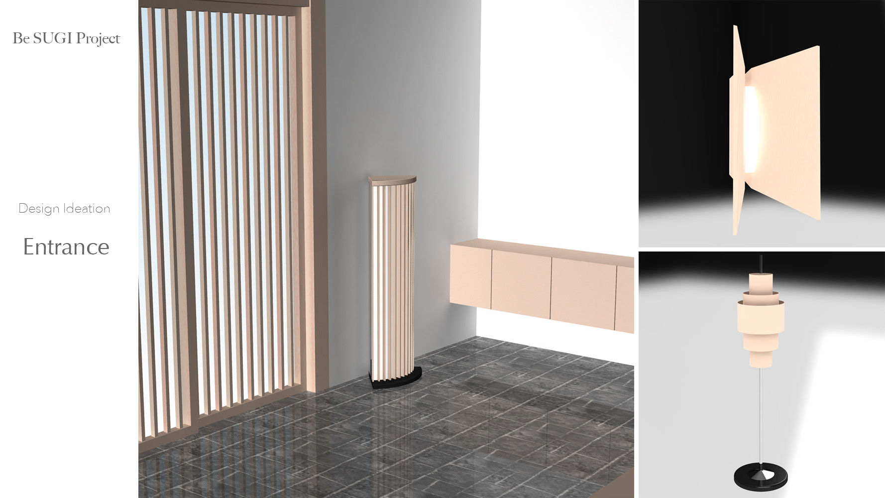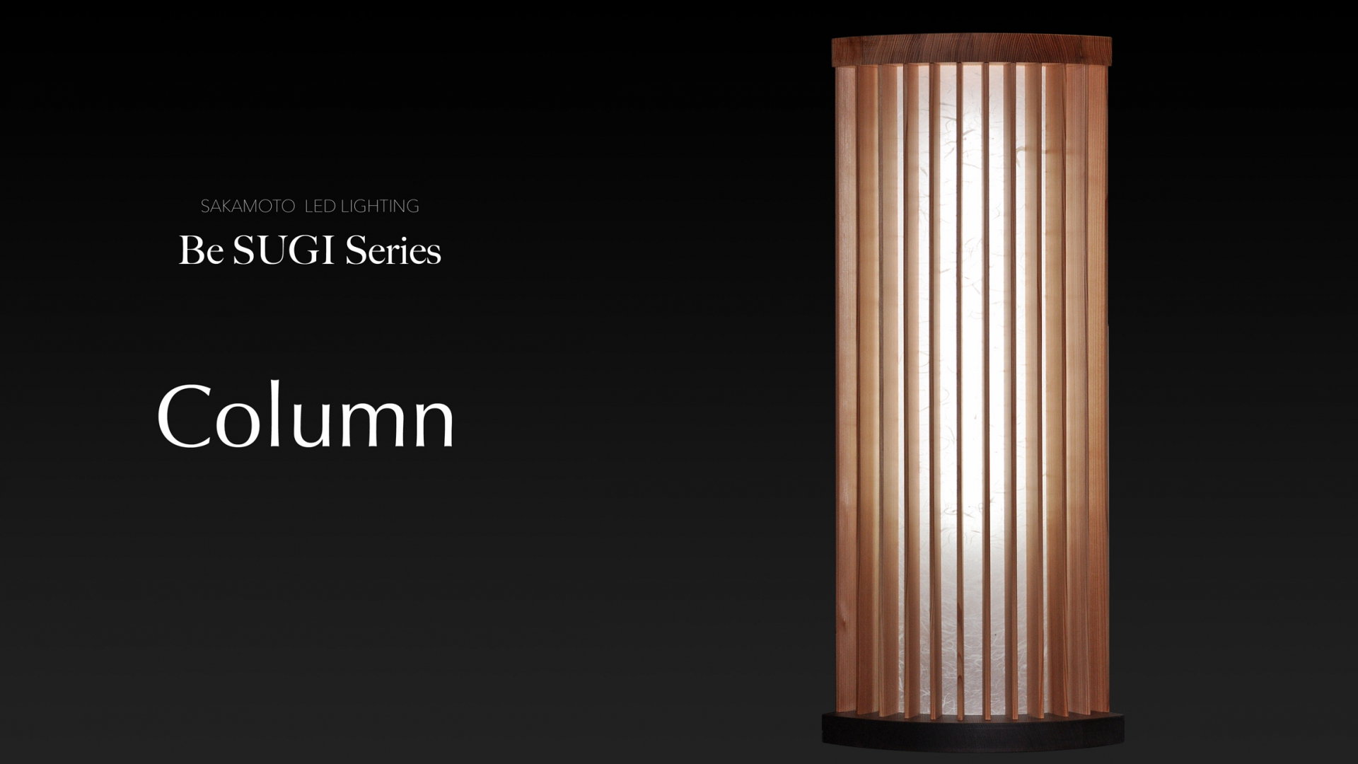 Columnはこの杉の柱をイメージ、そして明かりを照らすシェードの部分に昔の町家にあった格子窓を模した羽状の杉板を環状に配置しました。