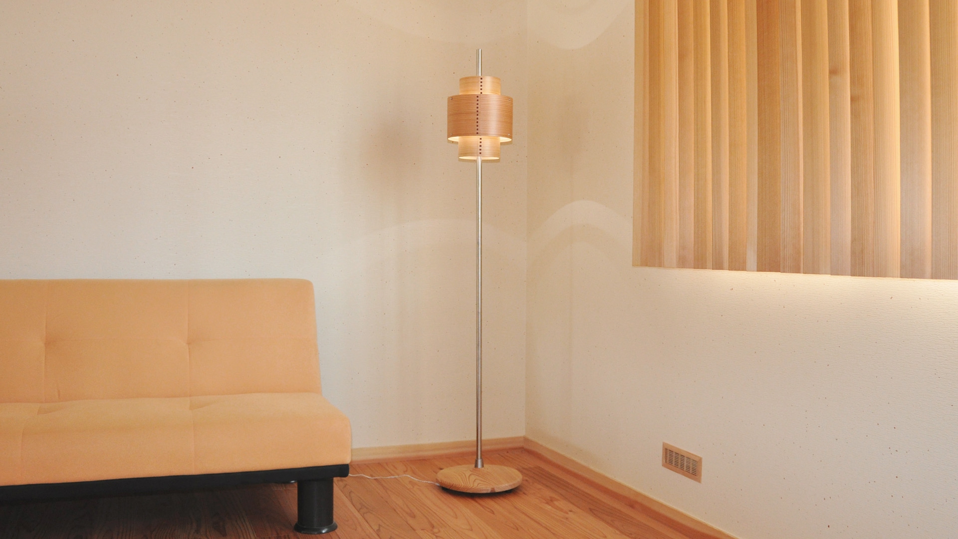 通常このようなスタンド型の照明では、ポールの上端に光源を設けシェードはそれよりも上方に配置する設計がなされます。