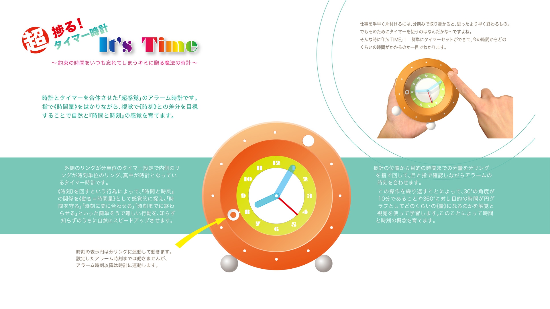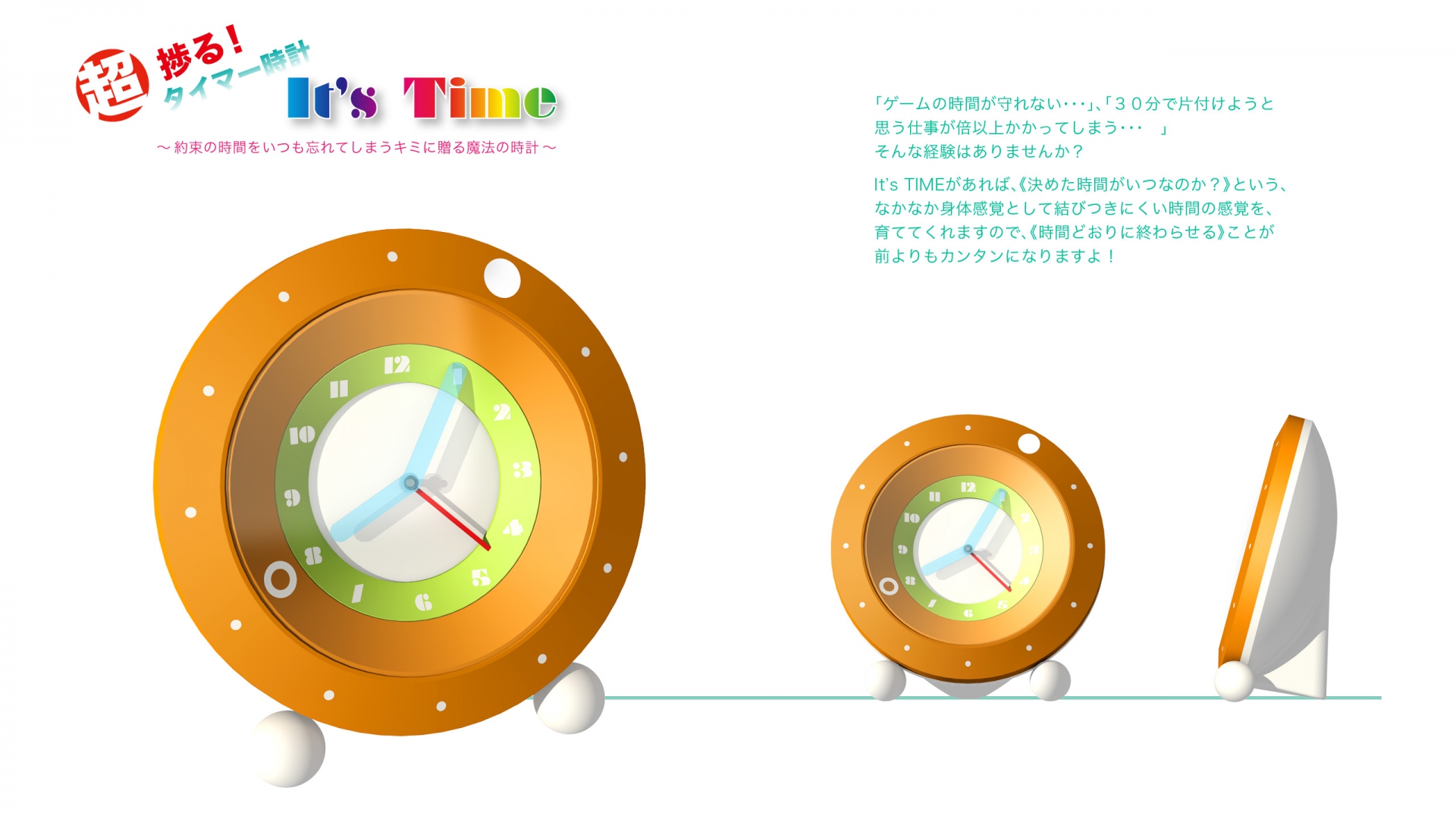 『It’s TIME !』は、このような時間と時刻の関係を、時計のアラームの設定を使うことで、時間と時刻の関係を幼い子供にわかってもらおう、学習してもらおうと思って考えたデザインです。