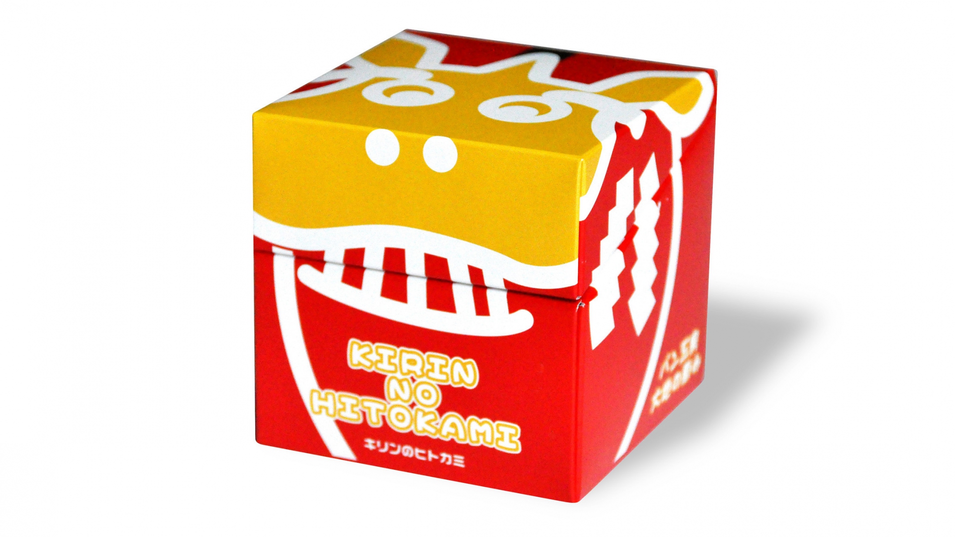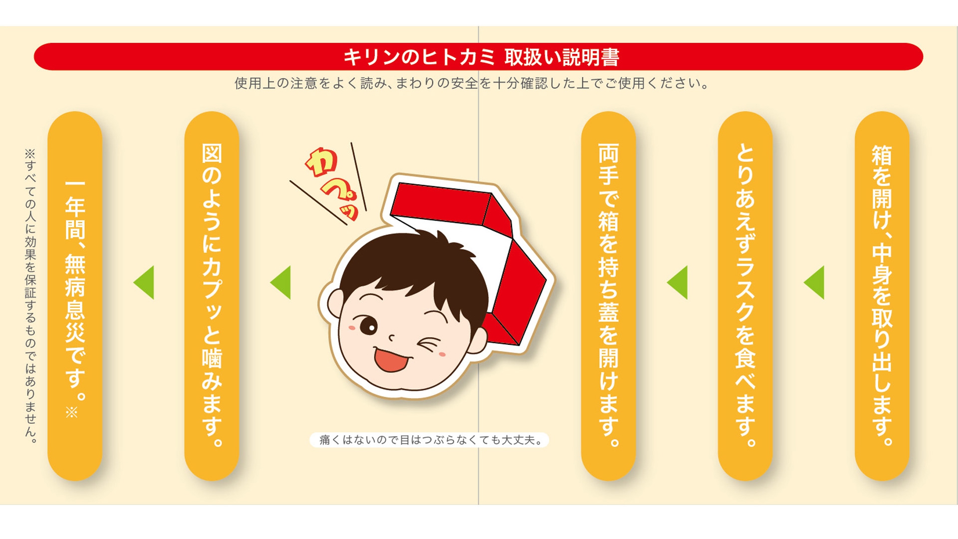 というわけで、麒麟獅子にちなんだ商品とすることに決まったのですが、麒麟獅子をキャラクターに使っただけでは面白くないと思い、パッケージを麒麟獅子の頭に見立て、この箱で頭を噛むことで、「獅子舞に噛まれるとその年は無病息災」という縁起担ぎを取り入れることにしました。