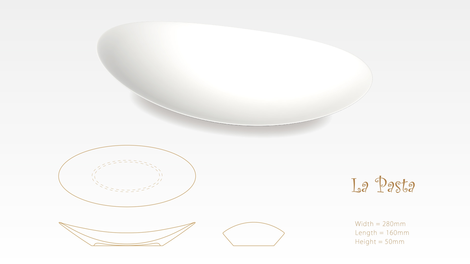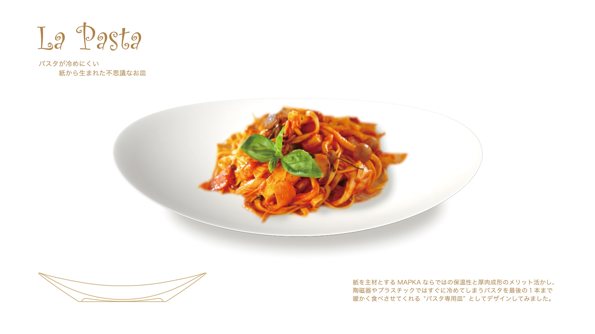 『La Pasta』は、「MAPKA」の保温性に着目、また紙を主材とすることによる「ヒケ」の少なさも考慮して、温かいものを温かいまま味わうことのできる食器にしようと考え、冷めると一番困る食べ物ってなんだろ、ということでパスタ料理をターゲットにしデザインを進めていきました。