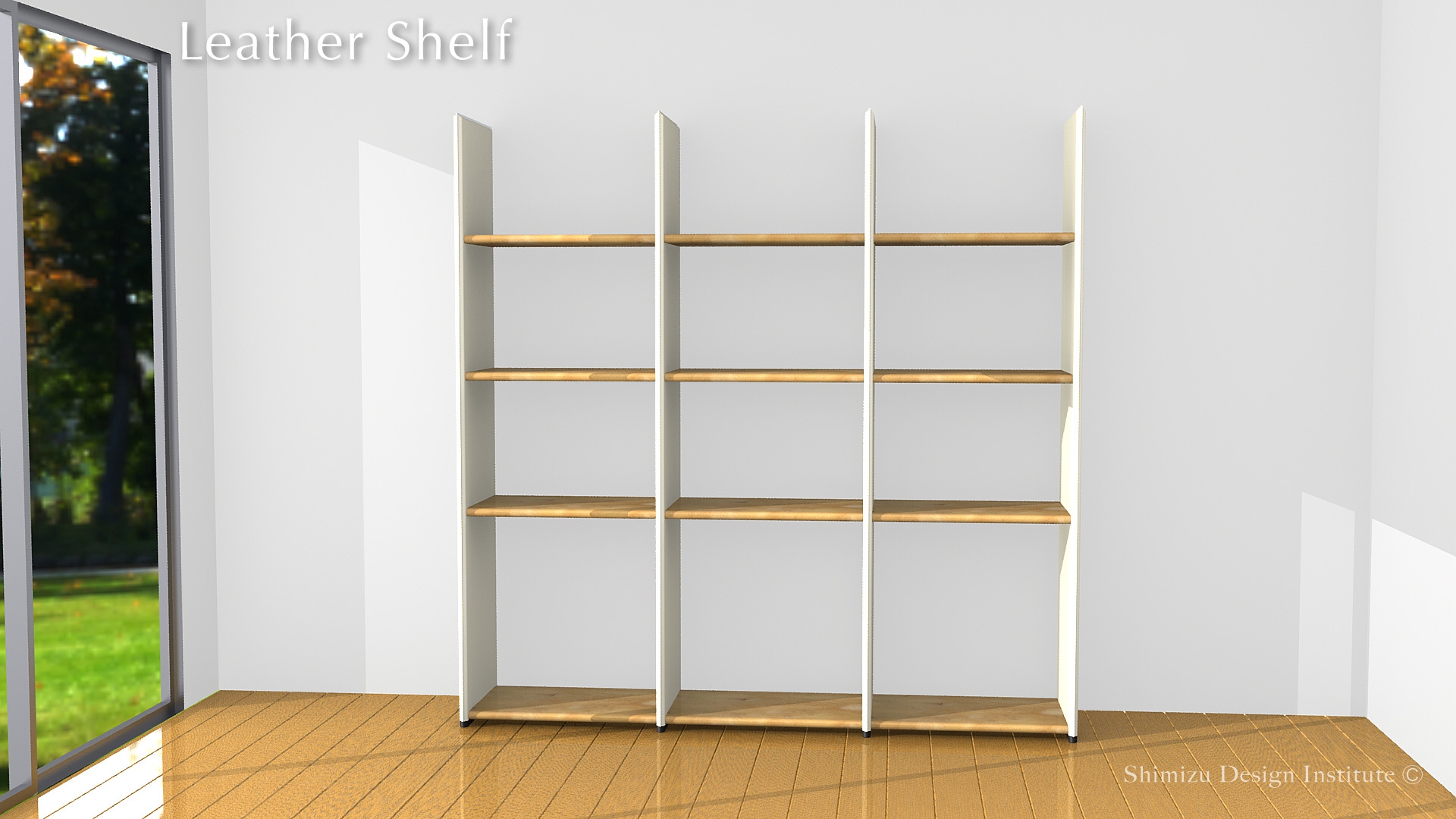 パンっと張った革の質感とイタヤカエデの杢目のコントラストが美しい革製シェルフとして提案してみました。