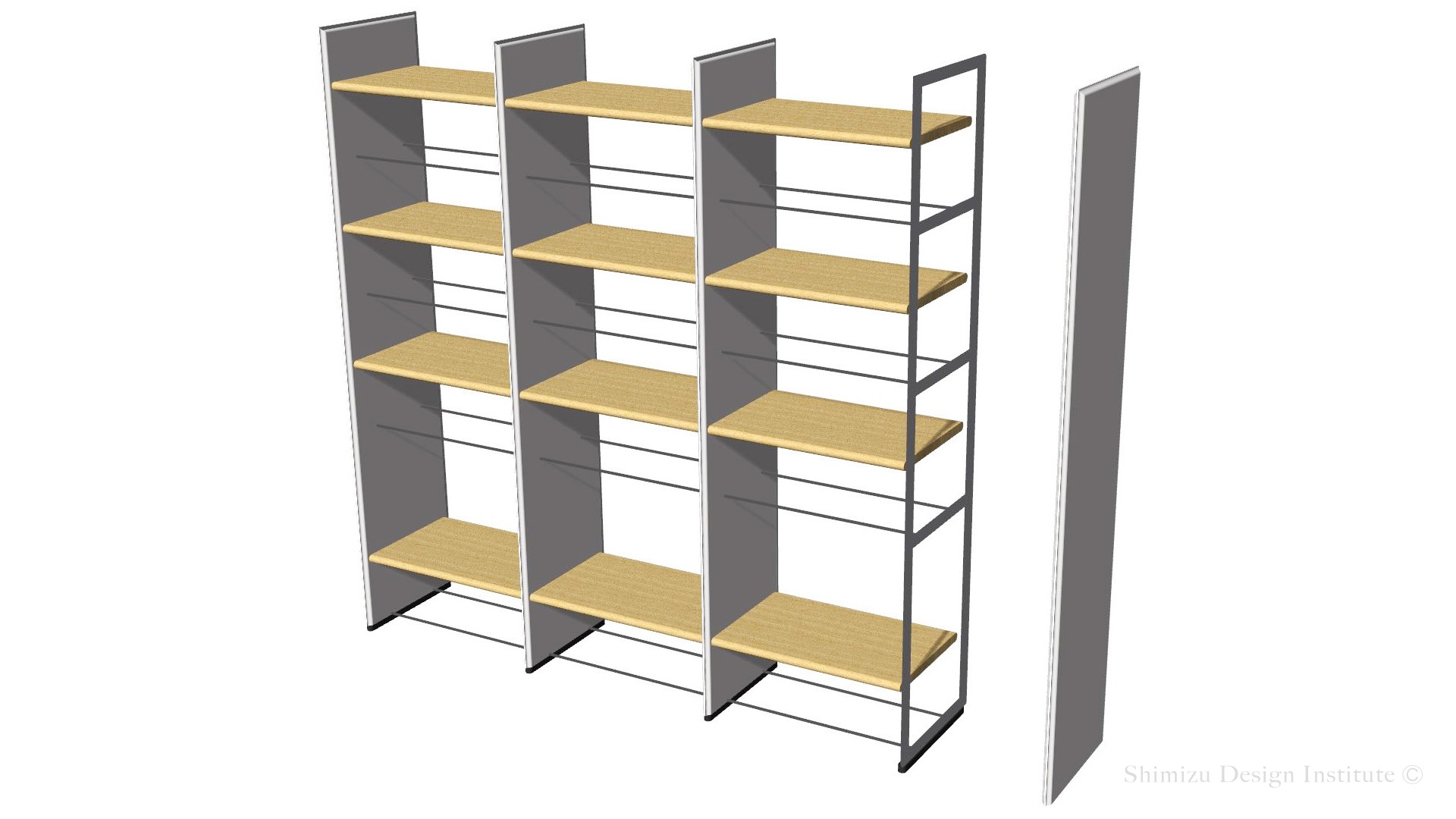 マリオ・ベリーニの革椅子、「キャブチェア」をヒントに、「ロの字」に組んだ楕円形(トラック形)の金属パイプをメインフレームに、なめし革の袋をかぶせ、これを1ユニットの縦板とし、鬼目ナットを仕込んだイタヤカエデの棚板に、通しボルトを介して本棚に組み立てる設計です。