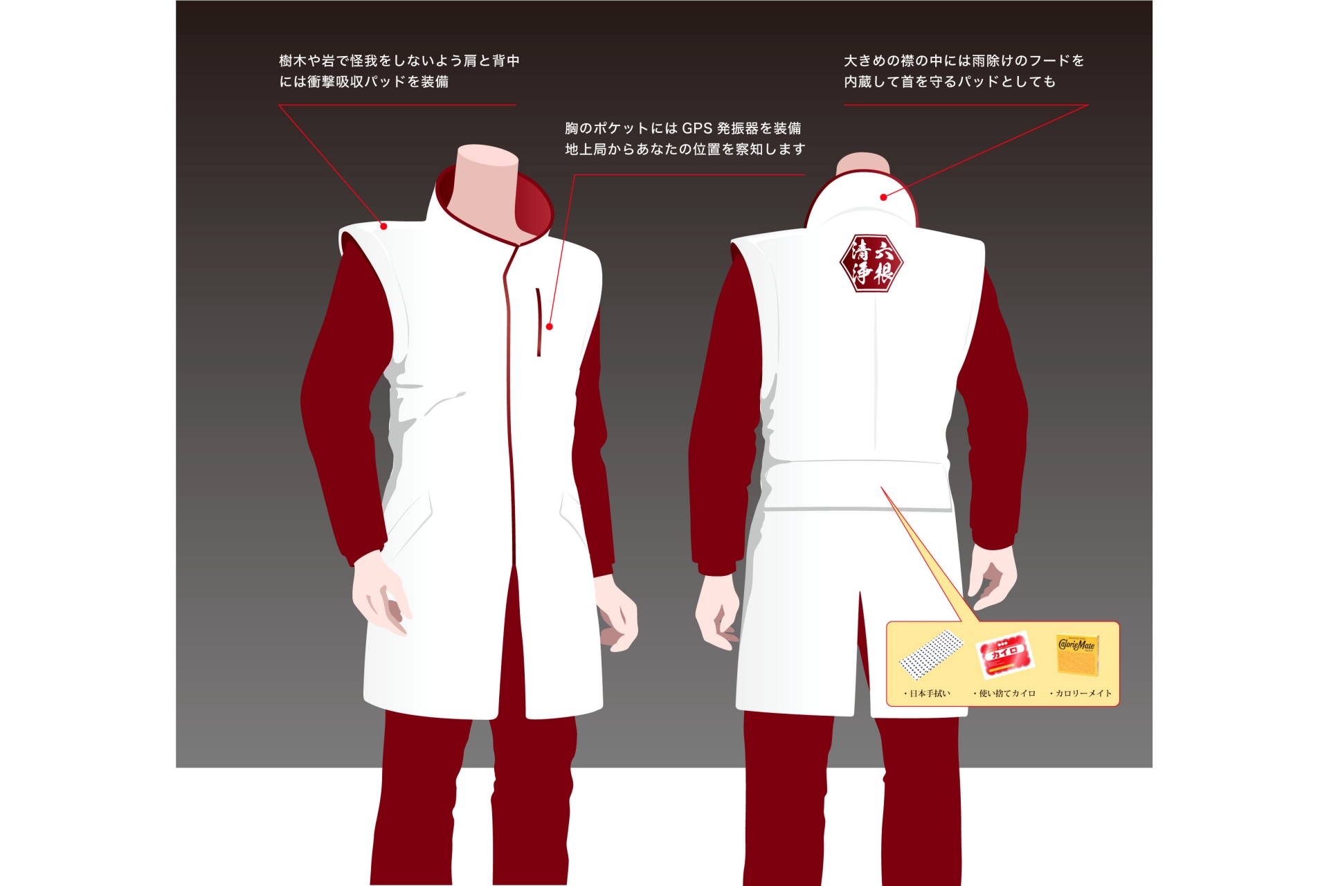 デザインは、当時『ナルト』のジャケットが結構気に入っていたので、スタンドカラーのジャケットをベースに、投入堂の開祖のであり投入堂を建立したとされている『役行者(えんのぎょうじゃ))』のコスチュームを参考に、ノースリーブのジャケットにサバイバルキットと遭難時の現在地を知らせるGPSを仕込んだウエストポケットを特徴とする修験道ジャケットを考案。それに耐水性に優れたゴアテックスを素材としたアンダーウエアを組み合わせてデザイン提案としました。