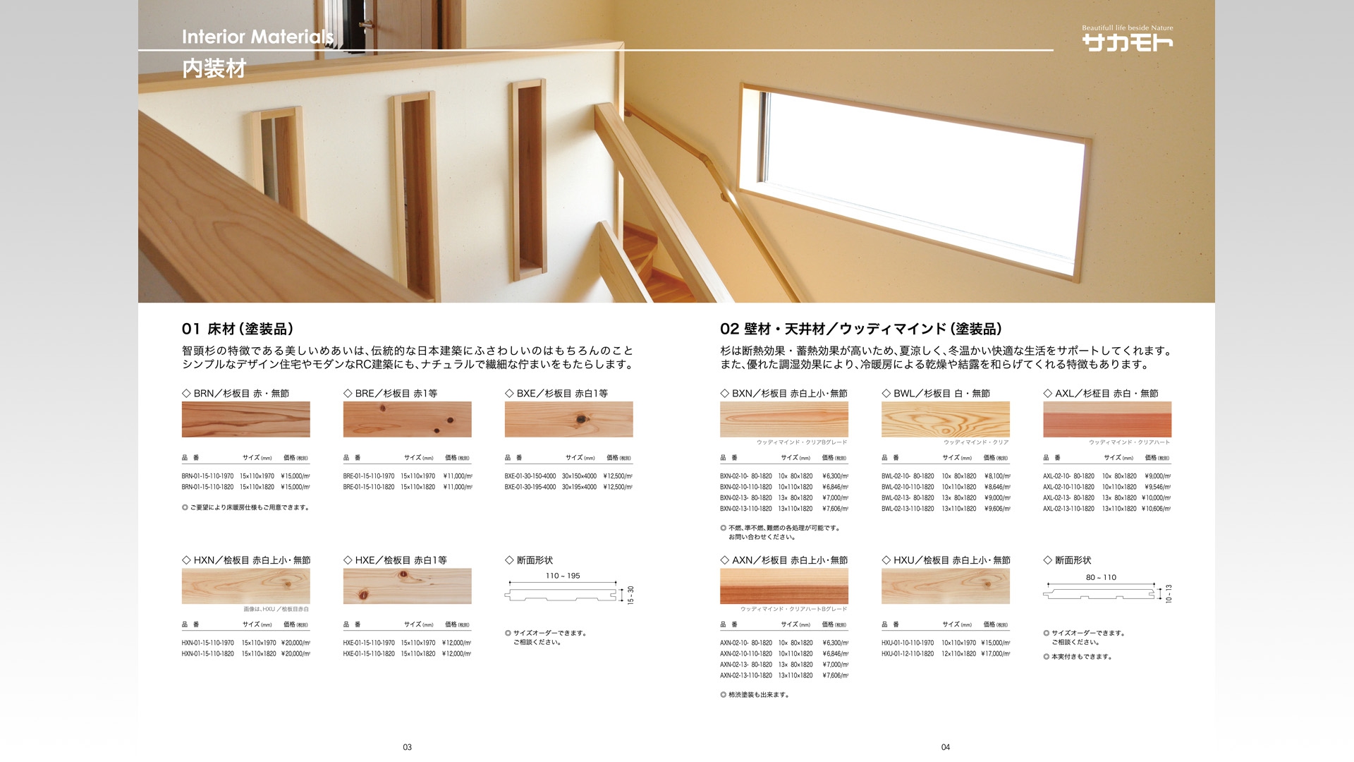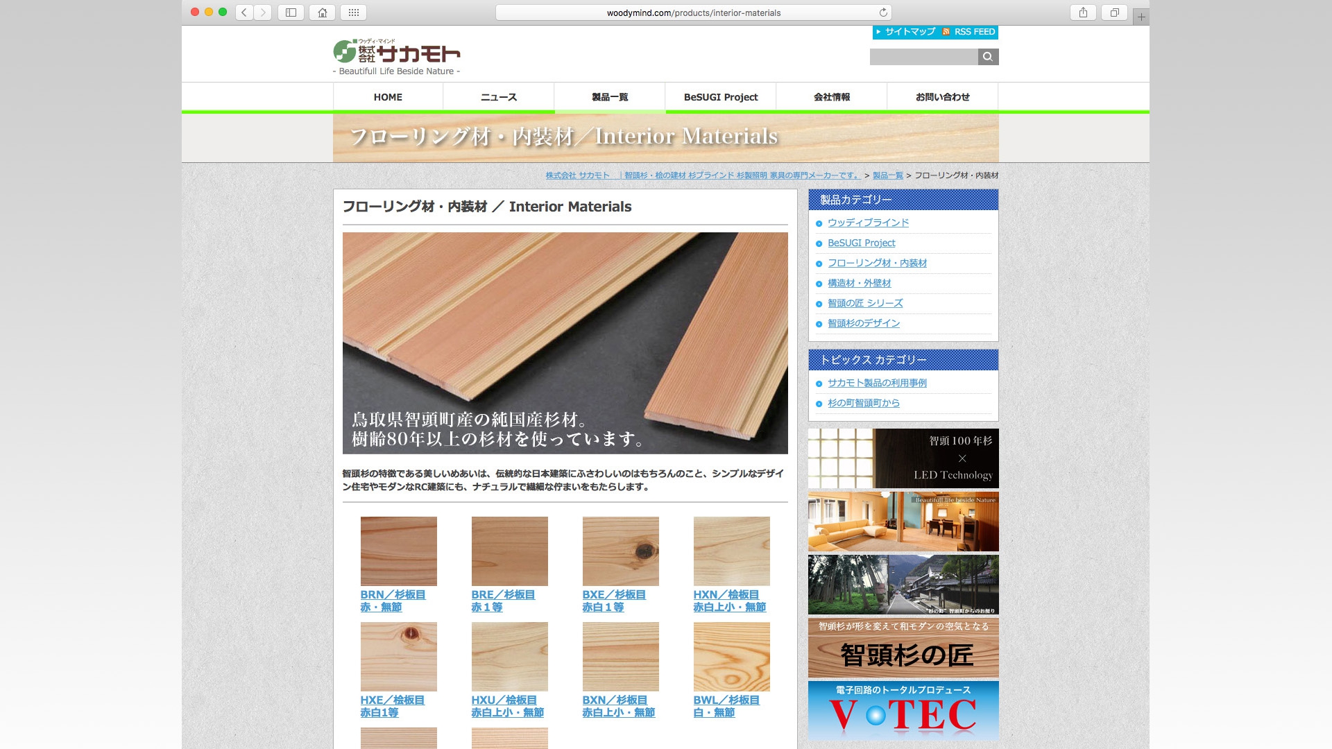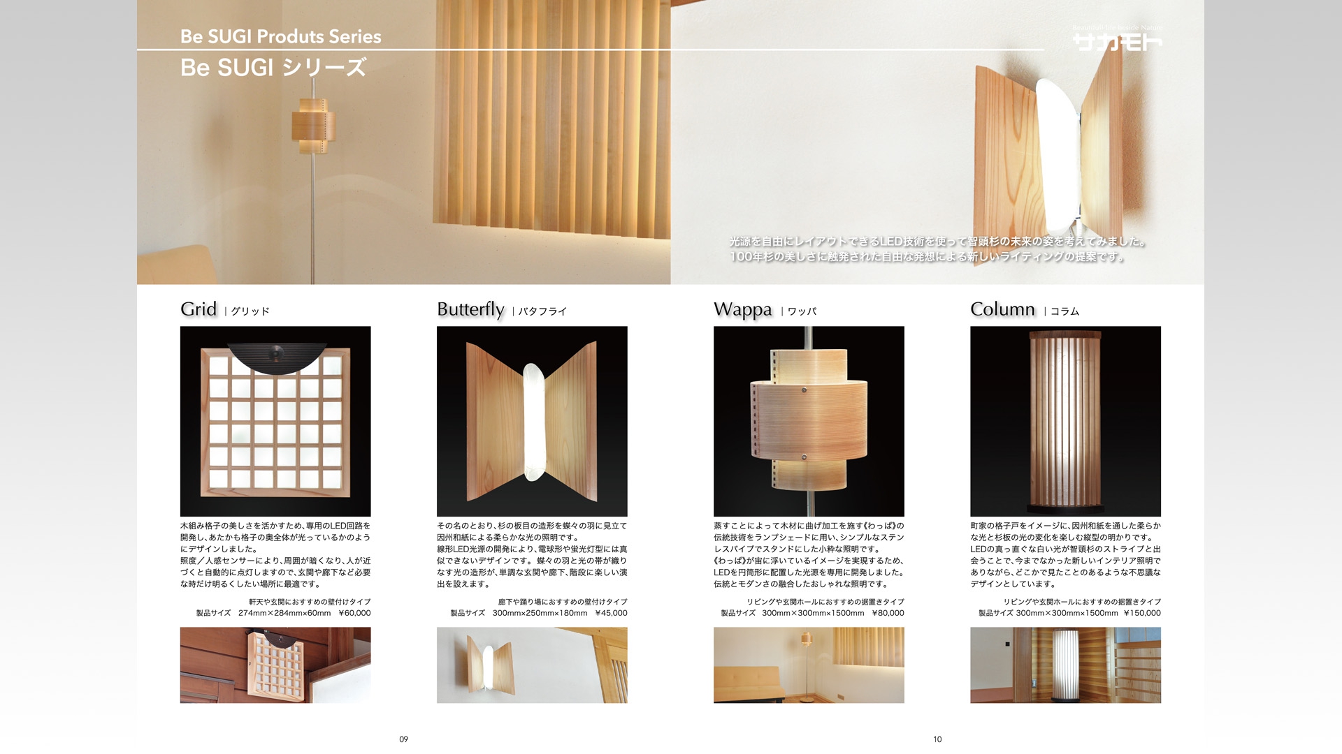 サカモトさんの製品は、扱う材の種類が多い上に、杉による家具やプロダクトもかなりあるので情報を整理するのが大変でしたが、ホームページ、カタログともに製品のグループを象徴するメインビジュアルを大きく取り、画像のインデックスで個々の情報へと誘導していく構造をとりました。