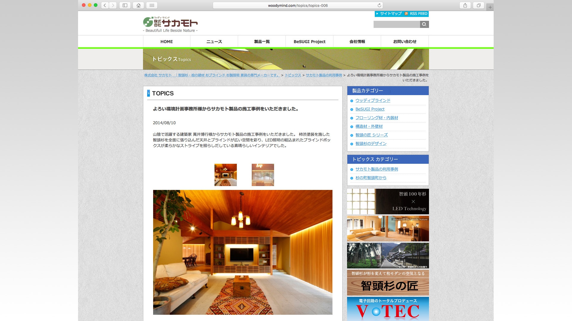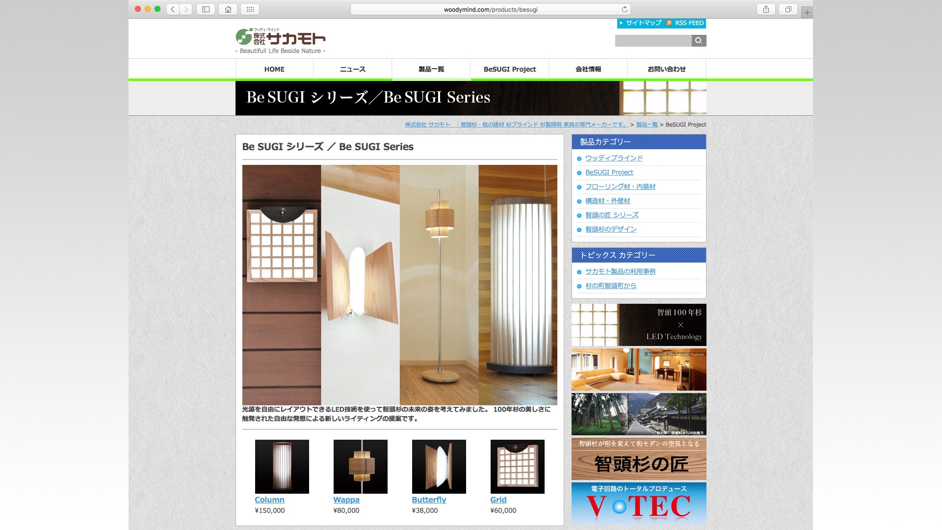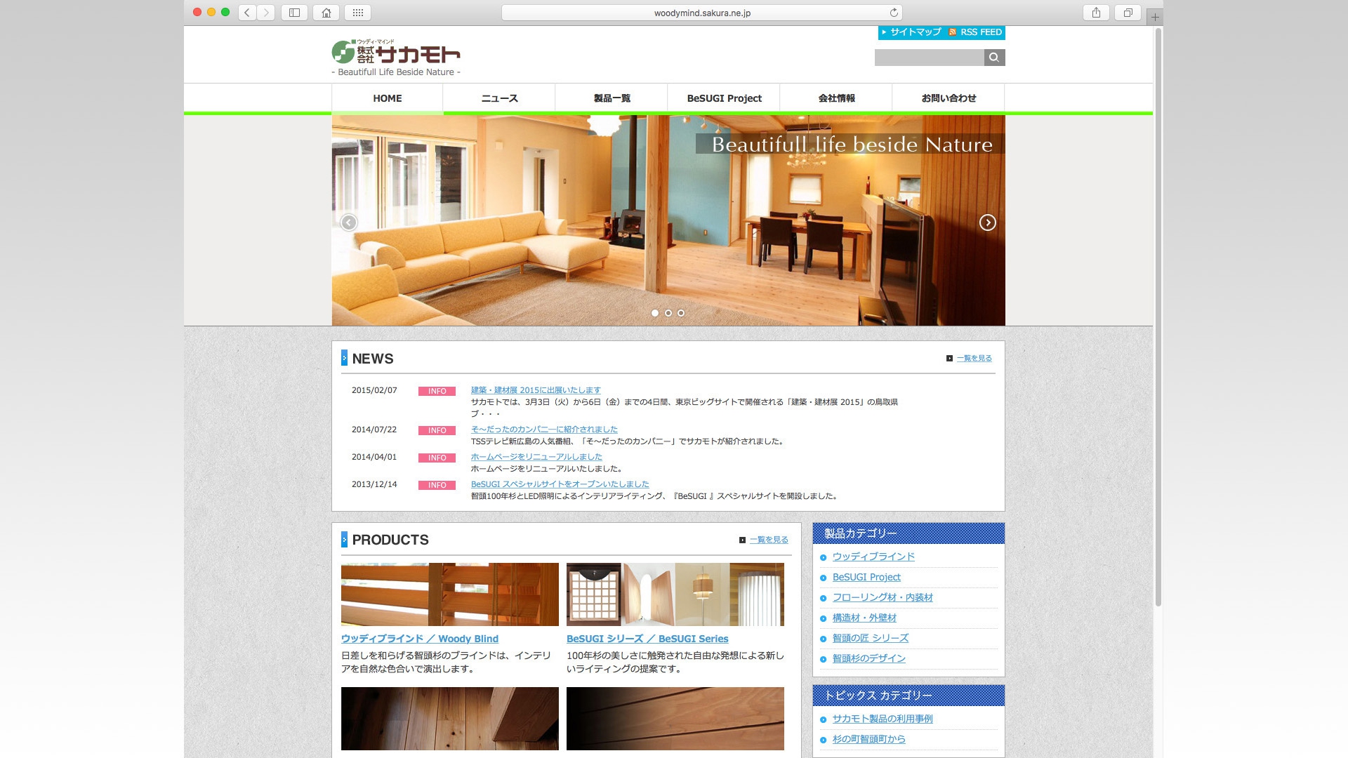 サカモトさんの製品は、扱う材の種類が多い上に、杉による家具やプロダクトもかなりあるので情報を整理するのが大変でしたが、ホームページ、カタログともに製品のグループを象徴するメインビジュアルを大きく取り、画像のインデックスで個々の情報へと誘導していく構造をとりました。