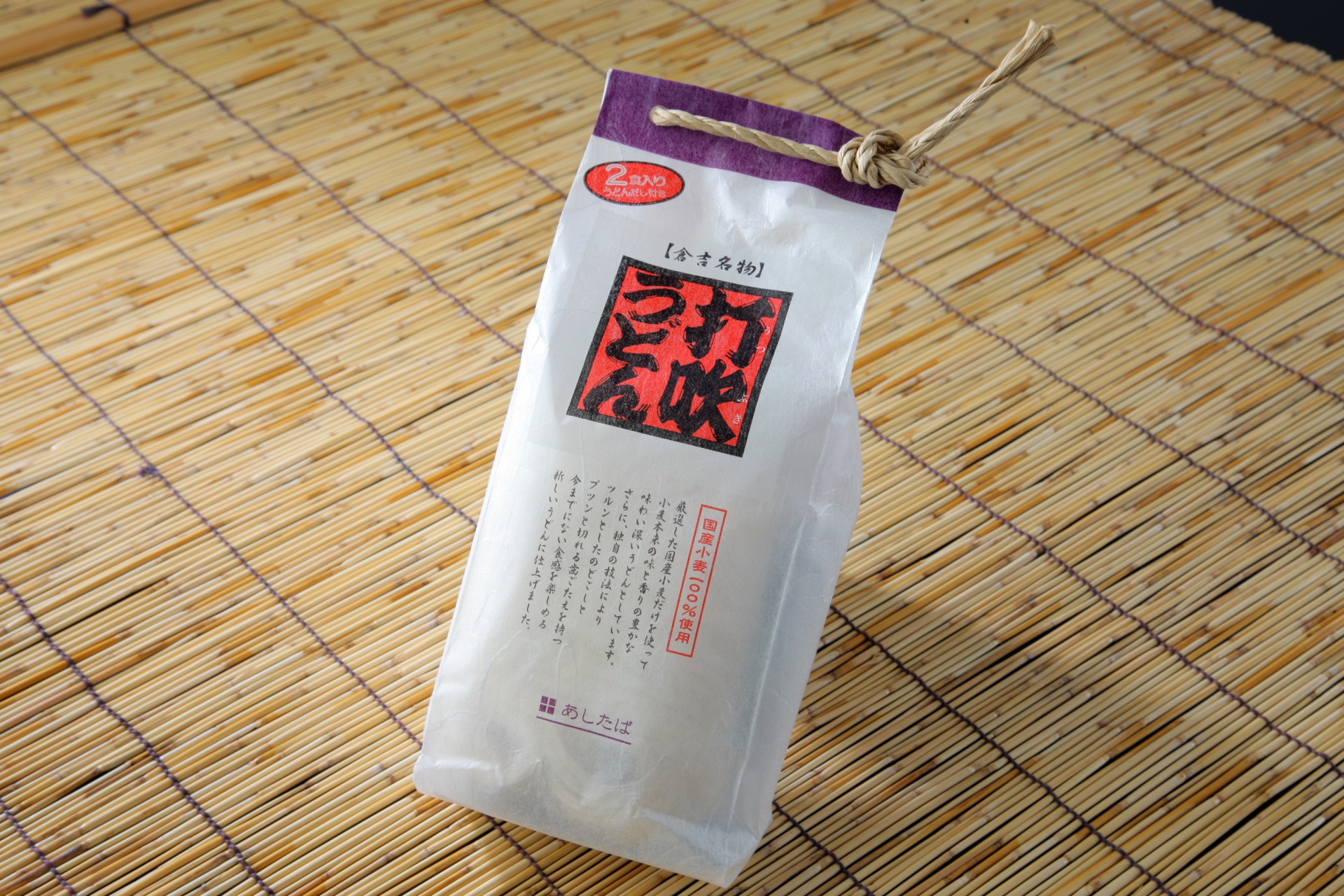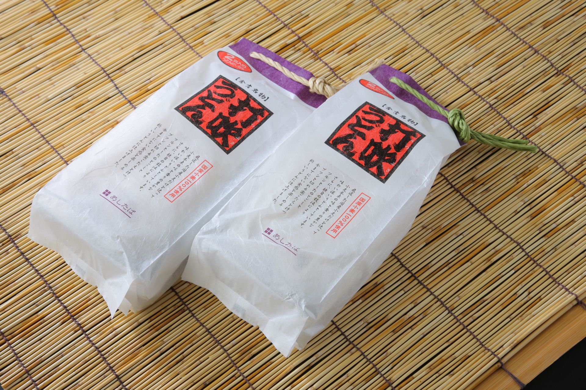 白を貴重とするパッケージに打吹うどんのロゴを重ね、封止にしめ縄を使い祭り囃子のようなデザインに仕上げました。