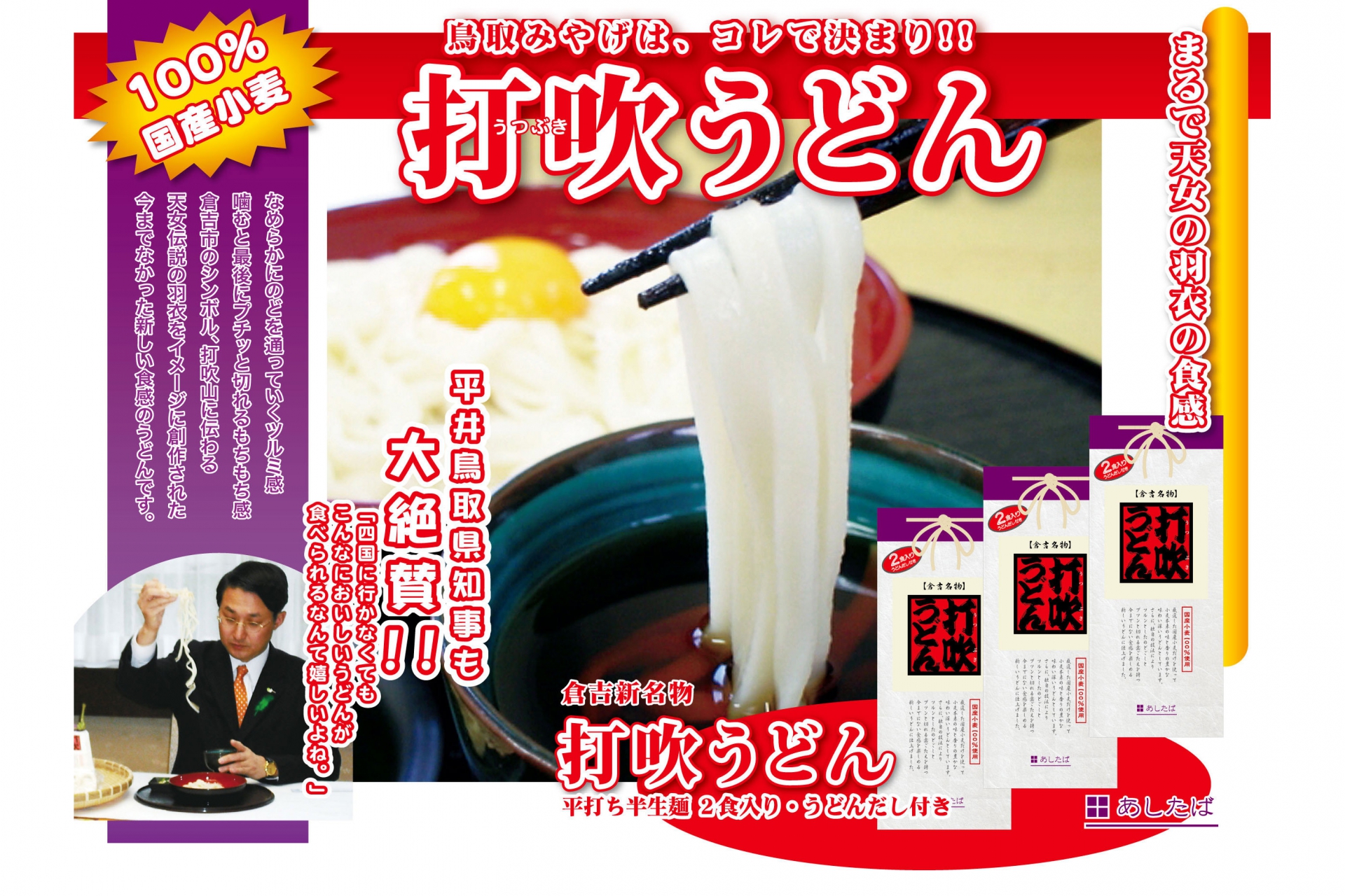 鳥取県倉吉市の打吹山に伝わる、羽衣だけを残し天に帰っていったお母さんを恋しんで、打吹山に登って太鼓を叩き笛を吹いていていた天女の子どもたちの姿を描いた「天女の羽衣伝説」を開発イメージに、つるりとした食感、しなやかなコシ、噛むことでふわっと広がる小麦の風味と端整な味を目指し、日本では北海道から九州まで、果てはカナダやタスマニアと世界中の小麦粉を取寄せ何度も試作を重ねて開発しました。